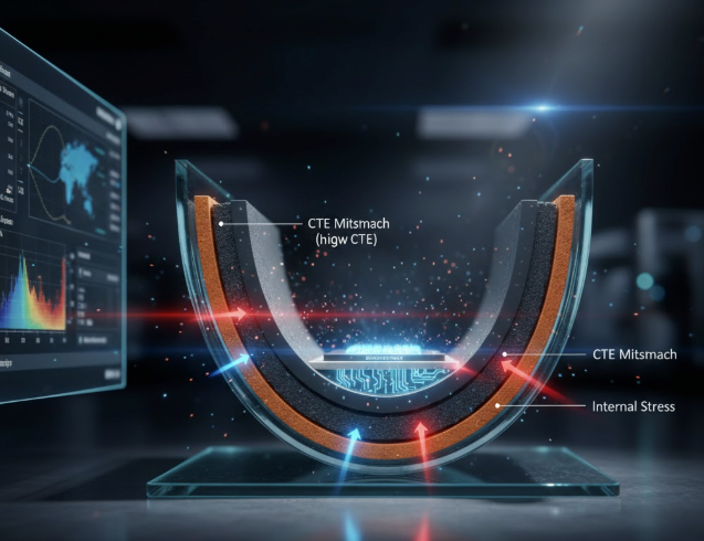 • Mismatch of thermal expansion coefficient:This is the fundamental cause of thermal stress. Silicon (~2.6 ppm/° C), encapsulation polymers (such as EMC, 7-20 ppm/° C), copper (~17 ppm/° C), and other materials experience asynchronous expansion and contraction during temperature cycling (such as reflow peak above 260 ° C), resulting in significant interfacial shear stress and overall bending moment. In 2.5D/3D packaging, the CTE gap between the silicon interlayer and the organic substrate is the main source of warpage.