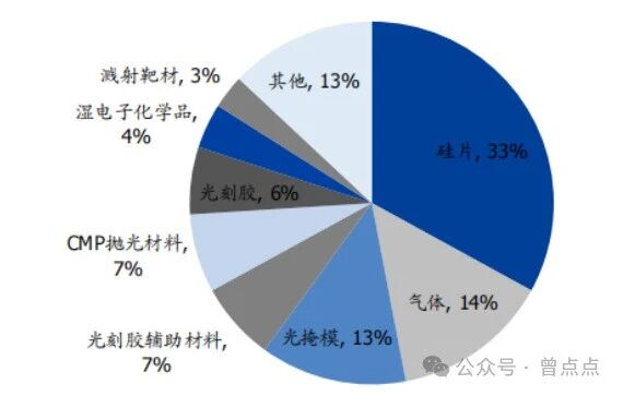 其中,半导体材料可进一步划分为前端晶圆制造材料和后端封装材料。前者主要包括硅片、光刻胶等,约占材料市场总规模的六成;后者则涵盖封装基板、引线框等。根据国际半导体产业协会(SEMI)的数据,2022年,半导体硅片以33%的占比位居全球半导体材料市场份额之首。