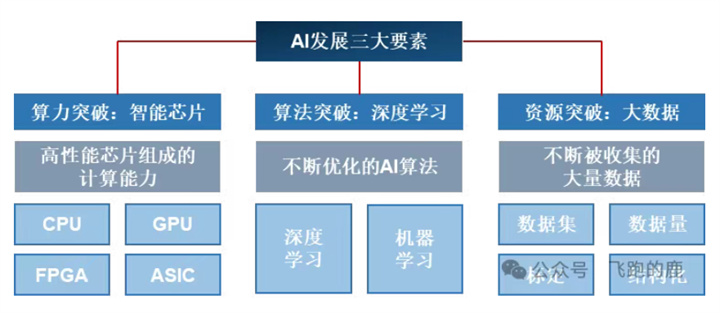 上游产业链部分核心部分是AI大模型,而AI大模型主要包括算力、算法和数据三大核心要素,具体如下: