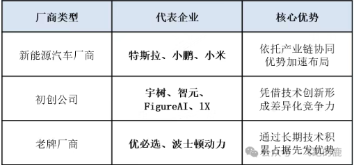 目前人形机器人尚未实现量产,市场主要由三类厂商构成: