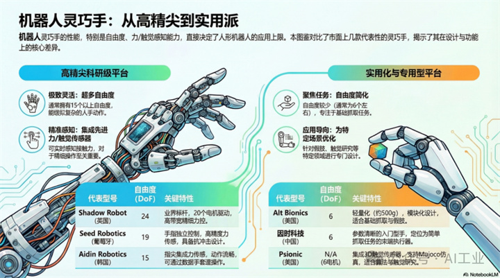 整体而言,这段视频的核心观点在于:人形机器人的能力上限在很大程度上取决于其“手”的自由度、力/触觉传感精度以及控制系统的性能。视频覆盖了多种技术路线的机器人手——从Aidin、Shadow、Sharpa、Seed等高自由度、全指独立可控且具备精细力控的灵巧手,到Alt Bionics、Inspire等仅具备6自由度、适用于基础抓取任务的简化型设计,再到Wanick、傲意、Prensilia、Psionic等专注于特定应用场景(如视觉遥操作、假肢、触觉研究)的机器人手,几乎涵盖了当前从科研探索、教学演示到工程落地的各类主流产品。若要进行灵巧手选型或横向对比,自由度数量、重量、供电规格、通信接口、软件生态支持以及力/触觉传感配置,正是这段视频中最值得提取并制作成表进行系统分析的关键信息。