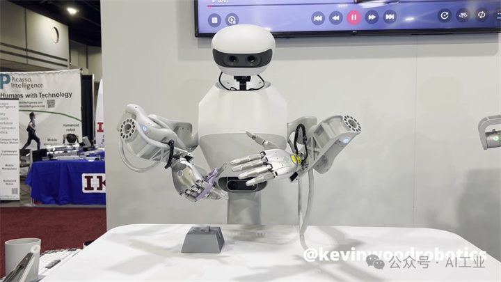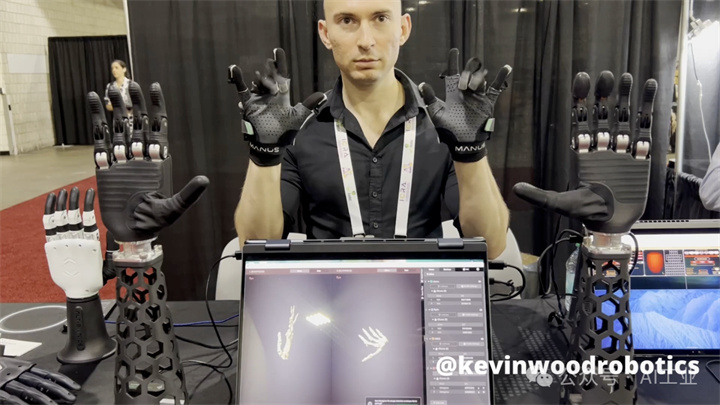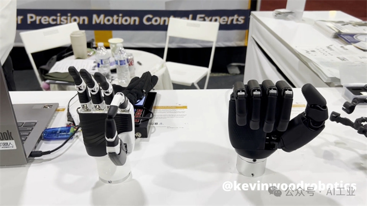 接下来是傲意公司开发的机器人手。这款手具有11个自由度,内部搭载6个主动执行器,重量约540克,支持ROS,采用RS-485和CAN总线进行通信,典型工作参数为24V电压和0.25A电流。演示中,其动作通过摄像头捕捉真人手部姿态来驱动,属于基于视觉的遥操作方式。从实际画面可见,手指的灵活性有一定局限,弯曲时通常表现为整段手指同时运动,属于典型的整体弯曲结构,单个关节缺乏独立控制能力,因此不适合作为超高灵巧度操作的平台。